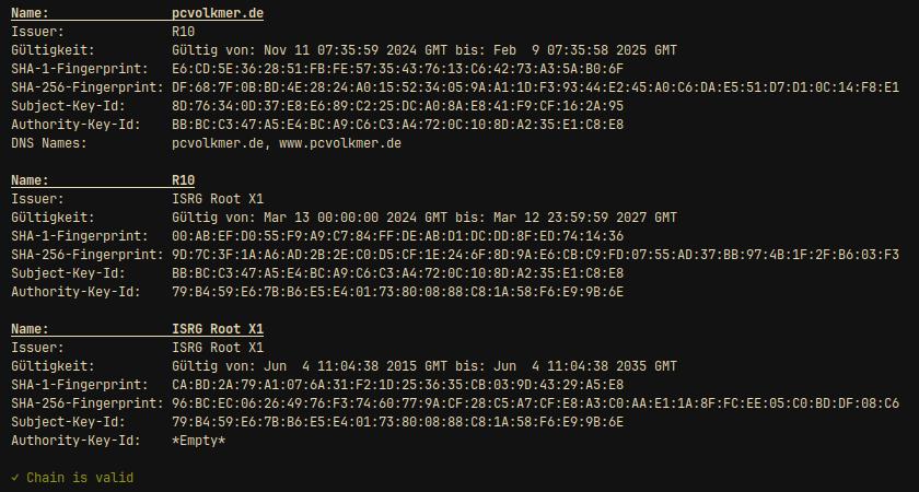 If the given certificate file only contains the certificate, but not the complete certificate chain, the optional argument --ca can be used to print the whole chain.